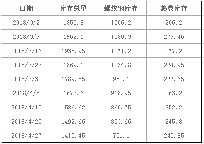 據中鋼網數據顯示,4月27日全國社會庫存總量為1410.45萬噸,周環(huán)比下降82.21萬噸,與今年以來的峰值相比下降541.65萬噸左右,處于持續(xù)下降狀態(tài)。尤其是螺紋鋼庫存連續(xù)5周降幅都在50萬噸以上,顯示下游需求有超季節(jié)性的表現。不過仍需注意的是,一季度全國平均日產粗鋼235.72萬噸,是歷史同期最高值,4月上旬重點鋼企粗鋼日均187.6萬噸,旬環(huán)比增長5.05%,鋼產量仍然處于上升通道,對市場整體供應仍將形成階段性的抑制。