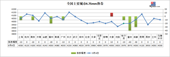 熱軋板卷:9月4日,全國24個主要城市4.75mm熱軋板卷均價4033元/噸,較上個交易日下跌5元/噸。今日黑色商品期貨市場低位震蕩,早盤現(xiàn)貨市場報價暫穩(wěn),受昨日夜盤跳水影響商家心態(tài)稍有走弱,盤中成交不佳,價格小幅下跌,午后市場情緒稍有穩(wěn)定,成交開始有所好轉(zhuǎn)。整周來看,供應(yīng)方面:產(chǎn)量繼續(xù)維持高位,鋼廠端受原料成本以及利潤支撐,主動減產(chǎn)意向不強(qiáng);庫存方面:社會庫存開始累庫,北材南下華東資源量加大,華東地區(qū)部分碼頭開始出現(xiàn)排隊集港現(xiàn)象,短期市場壓力華東大于華南大于華北。預(yù)計下周熱軋板卷或?qū)⒕S持弱勢震蕩運(yùn)行。