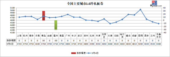 冷軋板卷:9月4日,全國24個主要城市1.0mm冷卷均價4681元/噸,較上個交易日持平。基本面看,冷軋下游需求上升是拉動最近價格上漲的最強(qiáng)因素,下游制造業(yè)訂單增加,原材料消化明顯增加,帶動鋼廠直發(fā)終端訂單轉(zhuǎn)好,市場投放相應(yīng)減少,對價格有一定的支撐。綜合來看,下周國內(nèi)冷軋價格震蕩上行為主。