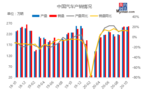 11月,汽車產(chǎn)銷分別完成284.7萬輛和277.0萬輛,環(huán)比分別增長11.5%和7.6%,同比分別增長9.6%和12.6%。截至本月,汽車產(chǎn)銷已連續(xù)8個(gè)月呈現(xiàn)增長,其中銷量已連續(xù)7個(gè)月增速保持在10%以上。臨近年末需求加速釋放,隨著各地利好政策延續(xù),基建帶動(dòng)工程車等需求回升,預(yù)計(jì)12月汽車銷量持續(xù)向好,帶動(dòng)用鋼需求。